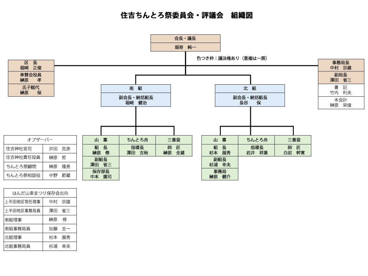 委員会は、祭の運営主体となる南北の2つの組、事務局により組織され、宮司・住吉区長を始めとする区民市民の皆様のサポート・ご協力により運営されています。また、委員会運営について見守り・正しく運営していくための指導を頂く評議会を設けており、最終決定機関となっています。